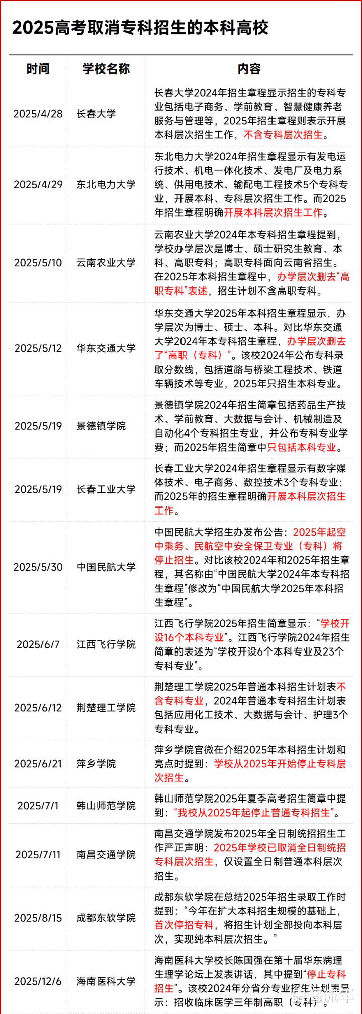 目前,已经官宣不招专科学生的本科高校,分别是长春大学、东北电力大学、云南农业大学、华东交通大学、景德镇学院、长春工业大学、中国民航大学、江西飞行学院、荆楚理工学院、萍乡学院、韩山师范学院、南昌交通学院、成都东软学院、湖南医科大学。